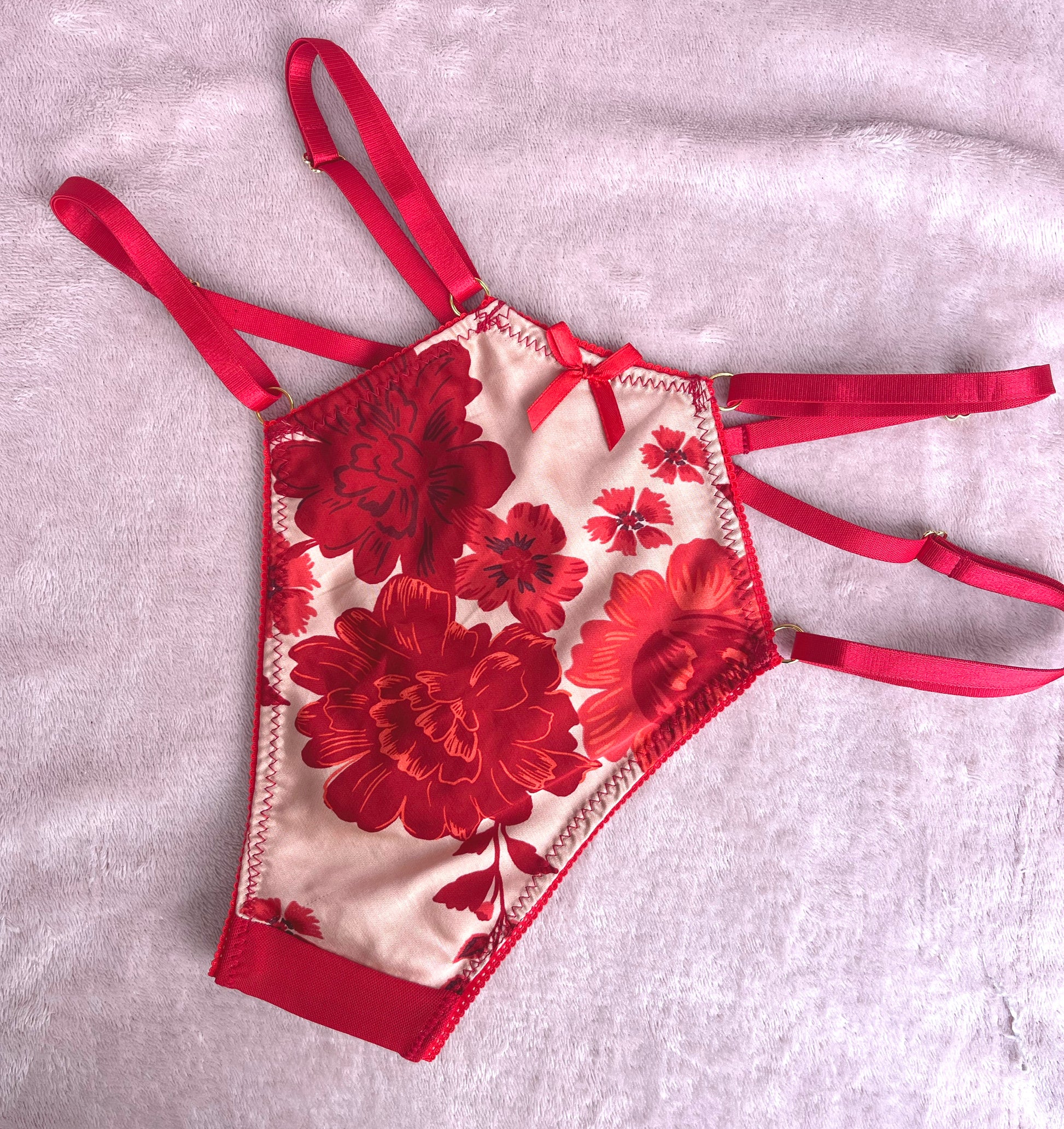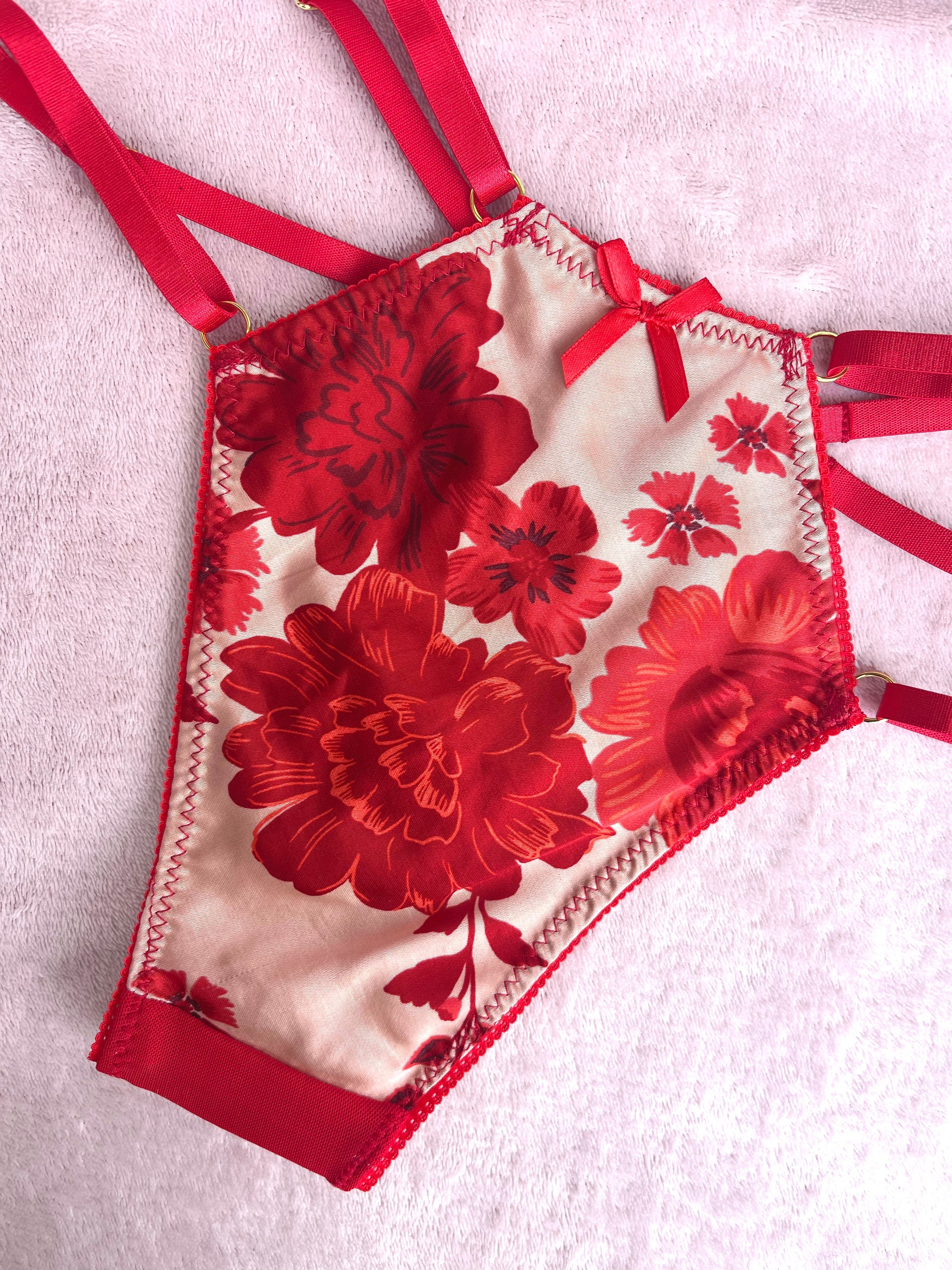 Soft silk with contrast red stretch mesh to make your silhouette POP!