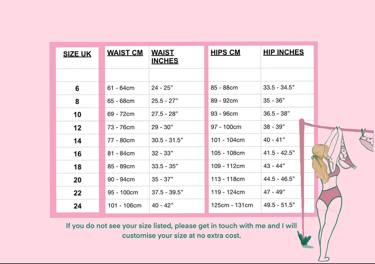 Upgrade your style with the Ultra High Waist Brief - it's comfy and cute! A thick, soft waist elastic lovingly hugs your figure while panelled mesh plays up your curves. Fabric that's super soft and stretchy makes your silhouette stand out! Don't know your size? Gifting someone and need advice? No worries! Just reach out and I'll help you out. And if your size isn't listed, I'll custom fit you for free! Lovingly handcrafted in my studio in Bonnie Scotland.